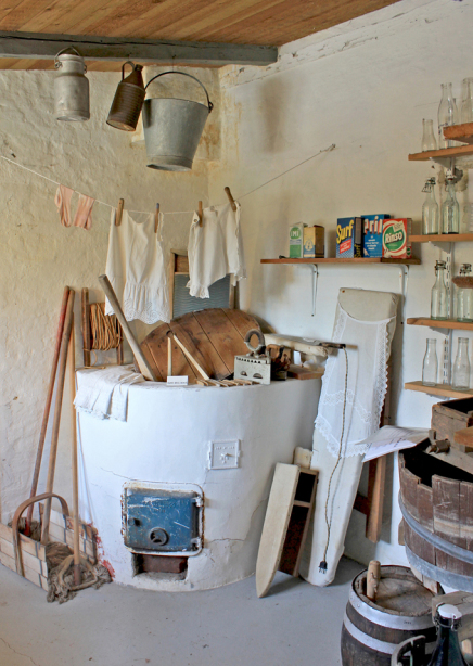 There are washboard, soap, ironing board, iron and a clothes line with littlesister´s clothes and socks with darned heels.